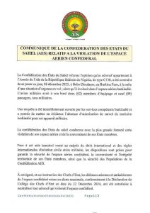 COMMUNIQUE FROM THE CONFEDERATION OF SAHEL STATES (AES) REGARDING THE VIOLATION OF CONFEDERAL AIRSPACE