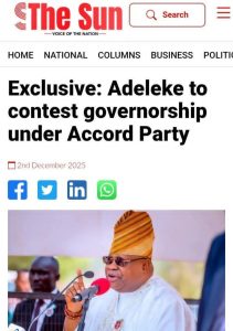 A source within the Accord Party confided in The Sun that Adeleke is contesting his re-election under the platform.