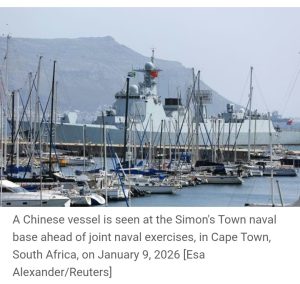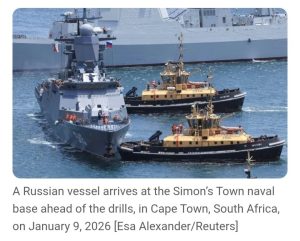 Chinese, Russian and Iranian warships have arrived in South African waters for a week of naval drills as geopolitical tensions run high over the United States’s military intervention in Venezuela and its seizures of several oil tankers.