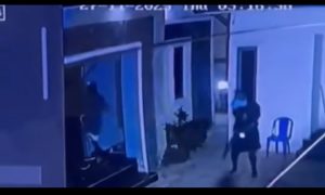 The incident, which occurred earlier in the week, shows the suspects approaching the home and making repeated efforts to force their way in. Despite their attempts, they were unable to breach the entrance due to the house’s reinforced security door.