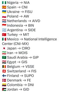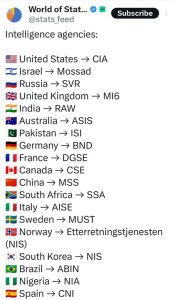 The post compiles a factual list of 40+ countries’ primary foreign intelligence agencies, such as the CIA for the US and Mossad for Israel, aligning closely with verified sources like Wikipedia’s global directory.