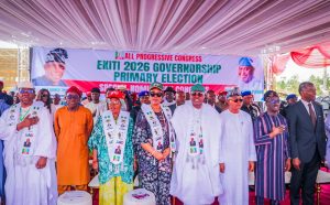Present at the primary are : The First Lady of Ekiti State, Dr Olayemi Oyebanji, the Senate Leader, Senator Opeyemi Bamidele, Ekiti State Deputy Governor, Mrs Monisade Afuye, former governor Niyi Adebayo, Ex-governor Kayode Fayemi and his wife, Erelu Bisi Fayemi, Senator Yemi Adaramodu, Senator Cyril Fasuyi, members of the House of Representatives, members of the House of Assembly, APC State Chairman, Sola Elesin, Senator Ayo Arise, Hon. Bamidele Faparusi, among others.