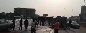 In a follow-up update, LASTMA confirmed that emergency responders and traffic officials were swiftly deployed to the scene. Efforts focused on offloading the spilled flour from the fallen truck and removing the damaged vehicles to restore traffic flow.