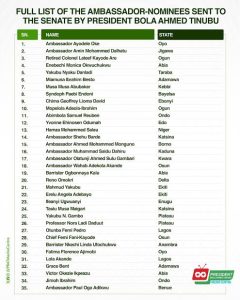 Tinubu had earlier forwarded three ambassadorial nominees last week: Ambassador Ayodele Oke (Oyo), Ambassador Amin Mohammed Dalhatu (Jigawa), and Retired Colonel Lateef Kayode Are (Ogun). “All three are in the pot for posting to the UK, USA, or France after their confirmation.”