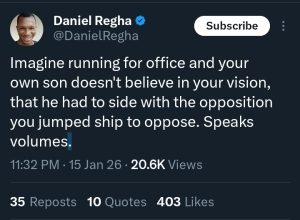 “Imagine running for office and your own son doesn’t believe in your vision, that he had to side with the opposition you jumped ship to oppose. Speaks volumes,” Regha wrote.