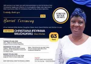According to a release by the family, a night of tribute will be held at the deceased’s compound in Amawa village on Tuesday January 6, 2026, by 7 pm, followed by the burial ceremony on January 7, and a Thanksgiving outing at Holy Trinity Anglican Church,Amawa Ogbunike on January 11, 2026.