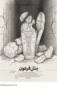 A message posted alongside the cartoon refers to historical and legendary kings such as the Pharaohs of ancient Egypt and Nimrod, a biblical figure of the book of Genesis, warning that they were “overthrown when they were at the height of their pride.” It also references Reza Khan and Mohammad Reza, the first and second Iranian shahs of the Pahlavi dynasty.