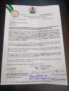 Confirming the receipt of the letter of interest by Mr Ayinde, the chairman of the ruling house, Abdul Lateef Adebayo Owoyemi, in a statement on Friday, said, “I urge all our family members, home and abroad, to remain calm and confident.