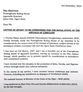 KWAM 1, in a letter dated December 3, 2025, addressed to the Fusengbuwa ruling house of Agunsebi Quarters, stated that his ambition stemmed from his being a bona fide son of the Oba Jadiara lineage.