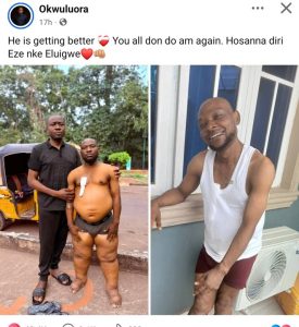 Sharing the update, Okwuluora expressed gratitude, noting that the man is steadily getting better and appreciating everyone who contributed to saving his life. The transformation has left many social media users stunned, with commenters describing the images as emotional and inspiring.