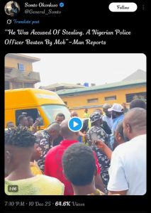 A police officer was seen being beaten mercilessly by a mob after he was accused of stealing.