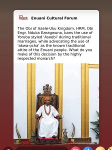 The Obi of Issele-Uku Kingdom, HRM, Obi Engr. Nduka Ezeagwuna, bans the use of Yoruba styled ‘Asoebi’ during traditional marriages, while advocating the use of ‘akwa-ọcha’ as the known traditional attire of the Enuani people.