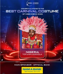 Miss Cosmo Nigeria, Tofunmi Adekola, has earned international recognition after winning the Best Carnival Costume award at the Miss Cosmo 2025 Grand Finale & Beauty Music Festival, held in Ho Chi Minh City, Vietnam, Charming Magazine Reports.