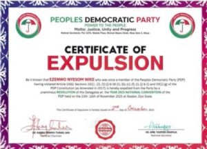 “Now that they are no longer members of our party, and now that the National Convention—which is the highest decision-making organ of our party—has expelled them, we have decided to issue them certificates of expulsion, so that, when they go to register with other political parties in Nigeria, they will show these certificates as proof that they are no longer members of the PDP, and so those parties will not accuse them of trying to belong to more than one political party.