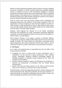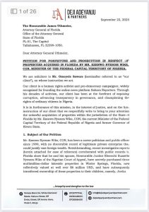 The petition urges the Florida authorities to invoke provisions of the Florida Money Laundering Act and Forfeiture Act to seize the properties, prosecute those involved, and enforce penalties for money laundering.