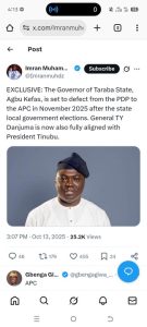EXCLUSIVE: The Governor of Taraba State, Agbu Kefas, is set to defect from the PDP to the APC in November 2025 after the state local government elections. General TY Danjuma is now also fully aligned with President Tinubu.