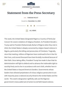 In 2020, Trump designated Nigeria as country of particular concern because of Christian’s persecution and violence against Christian’s.