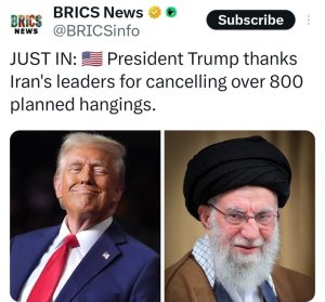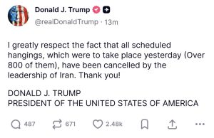 I greatly respect the fact that all scheduled hangings, which were to take place yesterday (Over 800 of them), have been cancelled by the leadership of Iran. Thank you!