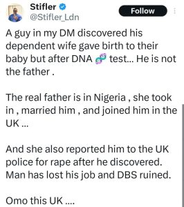 A guy in my DM discovered his dependent wife gave birth to their baby but after DNA 🧬 test… He is not the father .