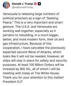 Venezuela is releasing large numbers of political prisoners as a sign of “Seeking Peace.” This is a very important and smart gesture. The U.S.A. and Venezuela are working well together, especially as it pertains to rebuilding, in a much bigger, better, and more modern form, their oil and gas infrastructure. Because of this cooperation, I have cancelled the previously expected second Wave of Attacks, which looks like it will not be needed, however, all ships will stay in place for safety and security purposes. At least 100 Billion Dollars will be invested by BIG OIL, all of whom I will be meeting with today at The White House. Thank you for your attention to this matter! President