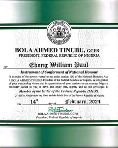 I am honoured and grateful to His Excellency, the President of the Federal Republic of Nigeria (@officialABAT ), for conferring on me the MFR national honour.